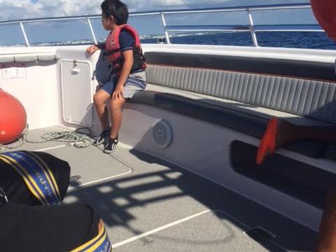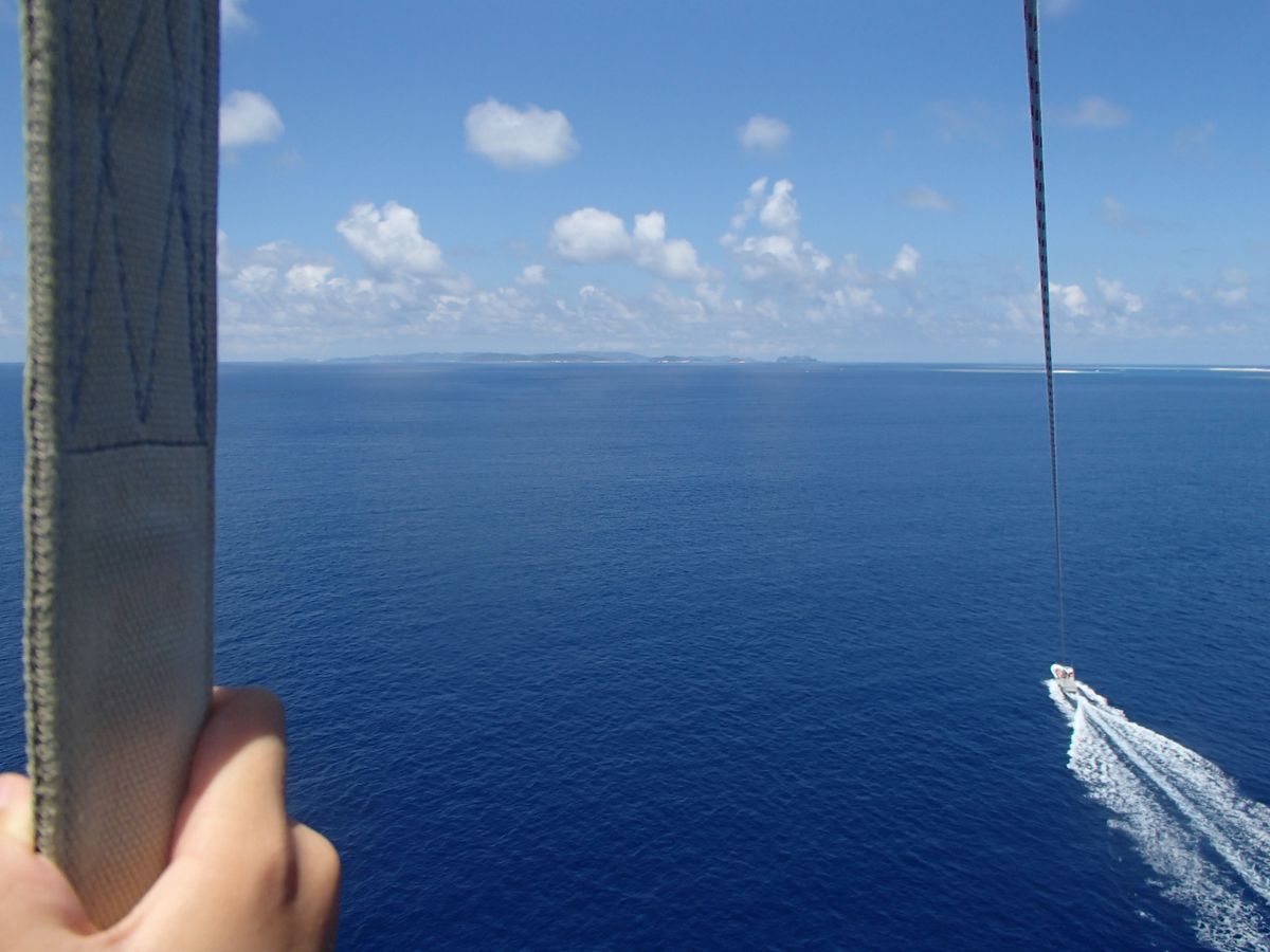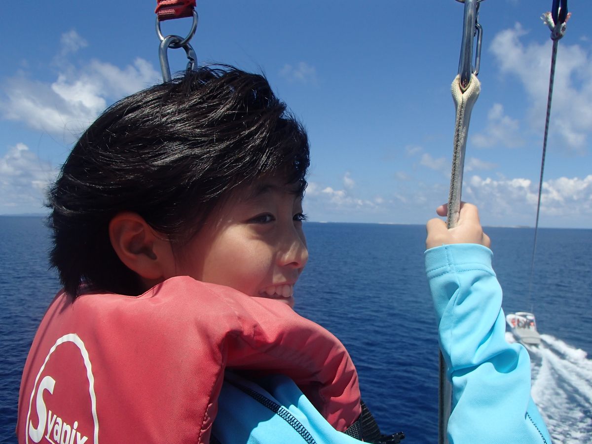出港は那覇市内のホテルからタクシーで10分足らずのところ。出張ついでにお一人で参加されている方もいらっしゃいました。ツアー会社の方は手際良く受付をして下さり、船酔いもなく、快適なボートでした。船内での説明も簡単で分かりやすく、不安もほとんどなく、私達親子はそのまま空へと飛び立ちました。あっっっっと言う間に40mの高さまで運ばれた私達ですが、二人とも不思議と恐怖心は全くなく、息子も“気持ちいいー!!!!”を連発していました。携帯で写真を撮る余裕があったほどです。この夏の一番の思い出として絵日記に書く、と息子も大満足していました。次回機会があったら、もう一度やってみたいと思います。