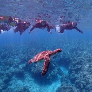 前夜豪雨、当日朝も曇り空で心配しましたが、予定通りに体験することができました。気さくな担当のお兄さんが丁寧に説明してくださりました。初めてのシュノーケリングと思ったよりしっかり泳いでいくことに少しドキドキしましたが、無事にウミガメさんと出会うことができ、2匹のウミガメが近くで泳いでいる姿や、また少し離れたところでも出会うことができ嬉しかったです!岸の近くはやや濁っていましたが、ウミガメのあたりの海は綺麗で珊瑚礁もよく見えました!