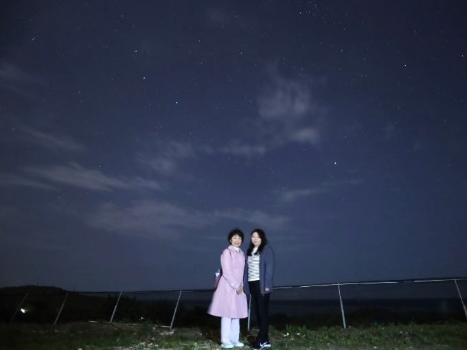 当日はあいにくの空模様でしたが、それでもわずかに雲の間から現れては消える星を一生懸命探して説明してくださり、楽しんでもらいたいという気持ちと星への愛が伝わってきました。虫スプレーや飲み物、声のかけかたなど細かいところも丁寧でしたし、三線の音色も美しかったです。写真撮影も工夫していて本当にお客様ファーストだな、と実感しました。
