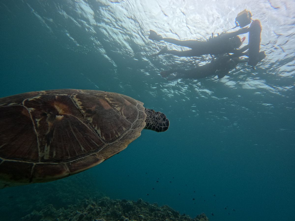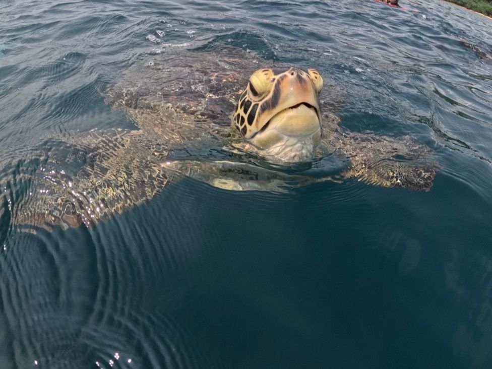 ツアーガイドのこうたさんが見つけたウミガメが運良く呼吸をしに水面に上がってきてくれて一緒に写真を撮ることが出来ました。