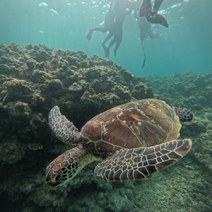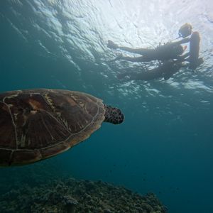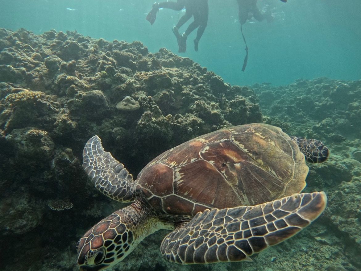 ビーチ到着後、ダイキさん誘導のもと浜から沖へゆっくりみんなでシュノーケリング/フィンの練習兼ねて沖に進みます。基本 遠浅ですので安心感あります。ある程度 深度が増してもその透明度はとてもクリアで熱帯のカラフルな魚や海底の珊瑚、エビなど見ることができました。突如ウミガメが2匹が目の前に出現し、ウミガメを間近で見ることはもちろん一緒に泳ぐことができました。ウミガメは人が近づいても漂うようにゆっくり泳ぐので本当に間近で観察できます。ダイキさんはシュノーケリング中,ウミガメの写真はもちろん我々の写真を海底から海上から色んな写真を撮影いただき帰りの車中で旅の記念に共有いただきました。