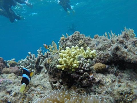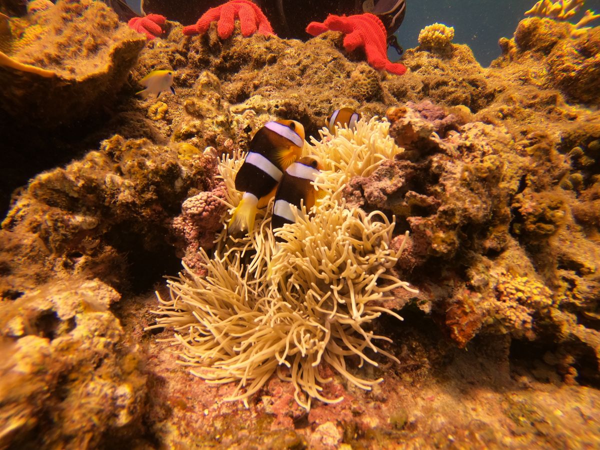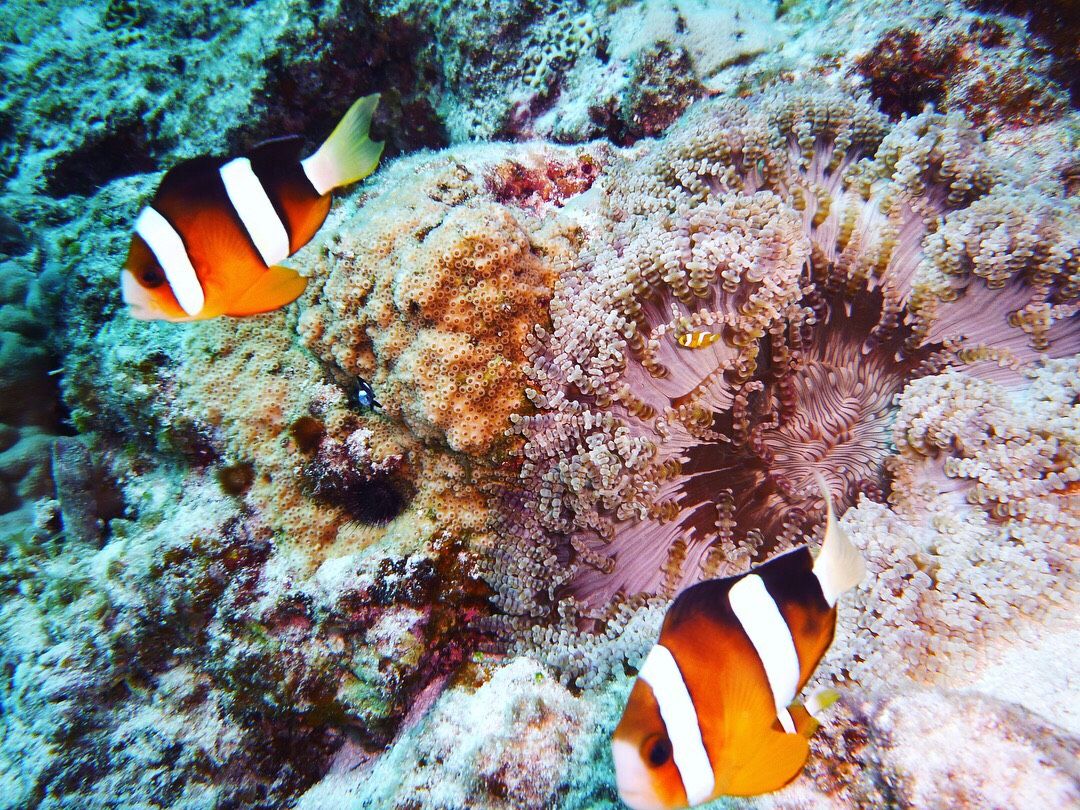そして到着!まずはシュノーケル。船酔いはあったものの海に入ってしまったらすっかり海の中に夢中になってしまっていました。次にダイビングの準備をして思った以上の重さに驚きつつも海に入りました。私は初めてと体験のため呼吸の仕方がわからなくなってしまっていた為、インストラクターの方が2人に1人のだったのをマンツーマンにしてもらい助かりました。ゆっくりと潜っていきカクレクマノミのいるところに案内してくれたり写真もたくさん撮っていただきました。とてもキレイな海に感激でした。その後、2つ目のポイントでは休憩し、3つ目のポイントで再度シュノーケルをしました。それから、シャワー浴びて着替えて帰港しました。今回、参加できてとても良かったです。私は船酔いがひどく、大変な面もありましたが、また参加したいと思いました。スタッフの方々にはご心配、ご迷惑おかけしてすみませんでした。次に参加する時は、酔い止め対策をがっつりして来たいと思います。