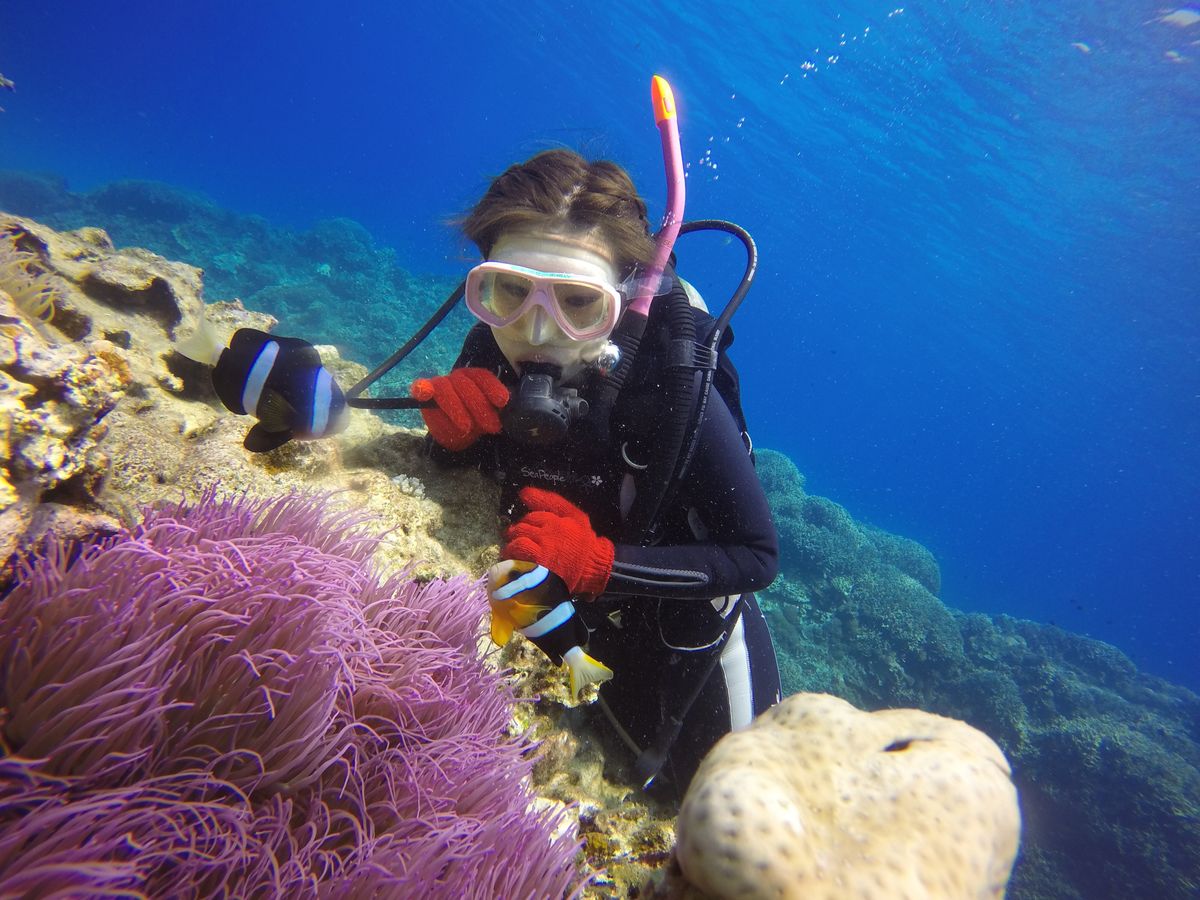 ダイビング中はインストラクターの方1人に対して2人ずつ手を繋ぎ、沖縄の透き通った綺麗な海に連れていってくれました。ダイビングの途中、カクレクマノミが居るスポットを間近で見れたり、綺麗な海の中で珊瑚と一緒に沢山の写真を撮影してくれたりと、とても良い思い出になりました!