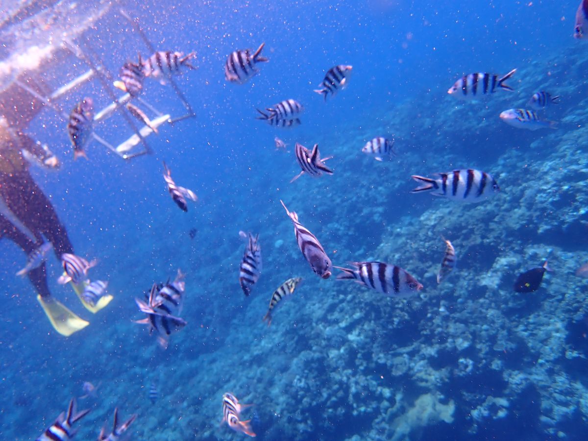 ホテルまで迎えに来ていただき、着いたらスーツと足のヒレのサイズ合わせをし船に乗船しました。出航前に日本人の参加者で集まり注意事項などの説明がありました。マスクや呼吸の仕方などの練習もしていただき初めての参加でも、とても安心出来ました。