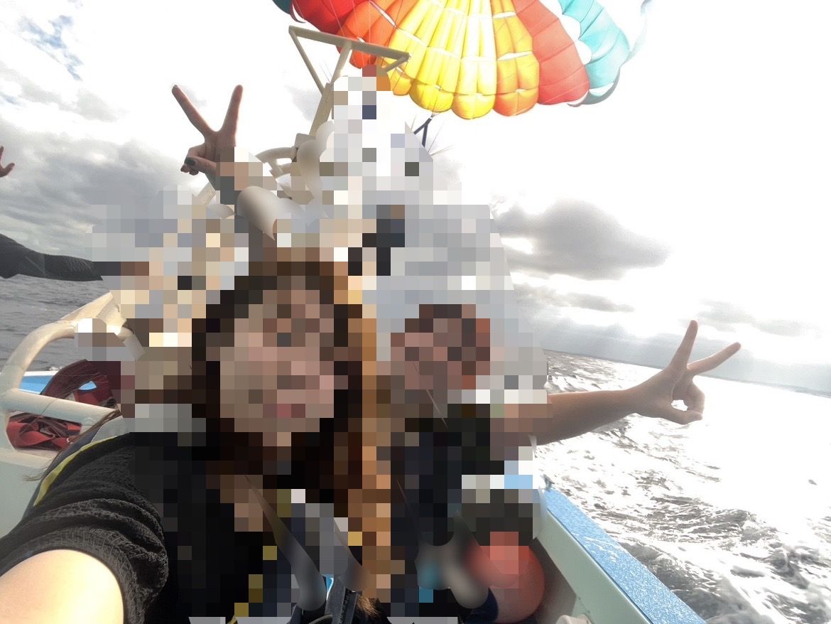 その後も皆んな次々と空中散歩を楽しんでました。パラセーリングが終わると船はすぐに港へ…。その途中…大学生位の女の子が、ムービーと写真撮ってたんですが要りますか?って声をかけてくれました。おばさん感激で泣きそうでしたよ。エアドロで…の言葉にフリーズのおばさんを横目にサササッとお互いの携帯操作して送ってくれました。あなたのお母さんの顔が見たいよって思いながらご両親と女子大生にただただ感謝でした。その後の沖縄は最初のミスが嘘みたいに最高な旅行となりました。スタッフの皆様、一緒に楽しんでくれた女の子達、沖縄の海と空…ありがとーって感じです。