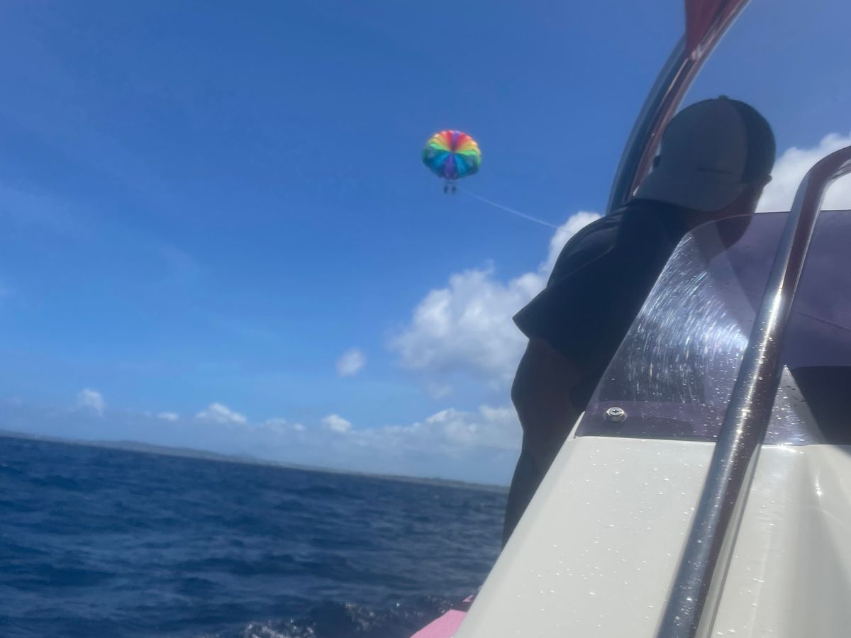 イケメンで優しいスタッフさん2人に丁寧にハーネスの付け方、パラセーリングを満喫するための安全について説明していただき、パラセーリングへいざ出発!ボートはぐんぐんスピードを上げて沖へ、もう心臓バクバクです。怯えてましたが、スタッフさんにハーネスを装着してもらい準備を整えると、フワッと浮かんで。それからは、まあどんどん上がる上がる!ハーネスの締め付けや違和感などはなく、心地良いスピードで200m上空へ。安定した姿勢で空から眺める沖縄の青い海、綺麗な空の中で心地よい風を感じながらの空中散歩は感動でした。ボートではノリの良い音楽をかけながらセイリングも楽しめて最高の思い出になりました。次回は小学生の甥っ子2人とパラセーリングを楽しもうと思います。 ハードなアクティビティではないので、年齢制限内みなさんにオススメです!