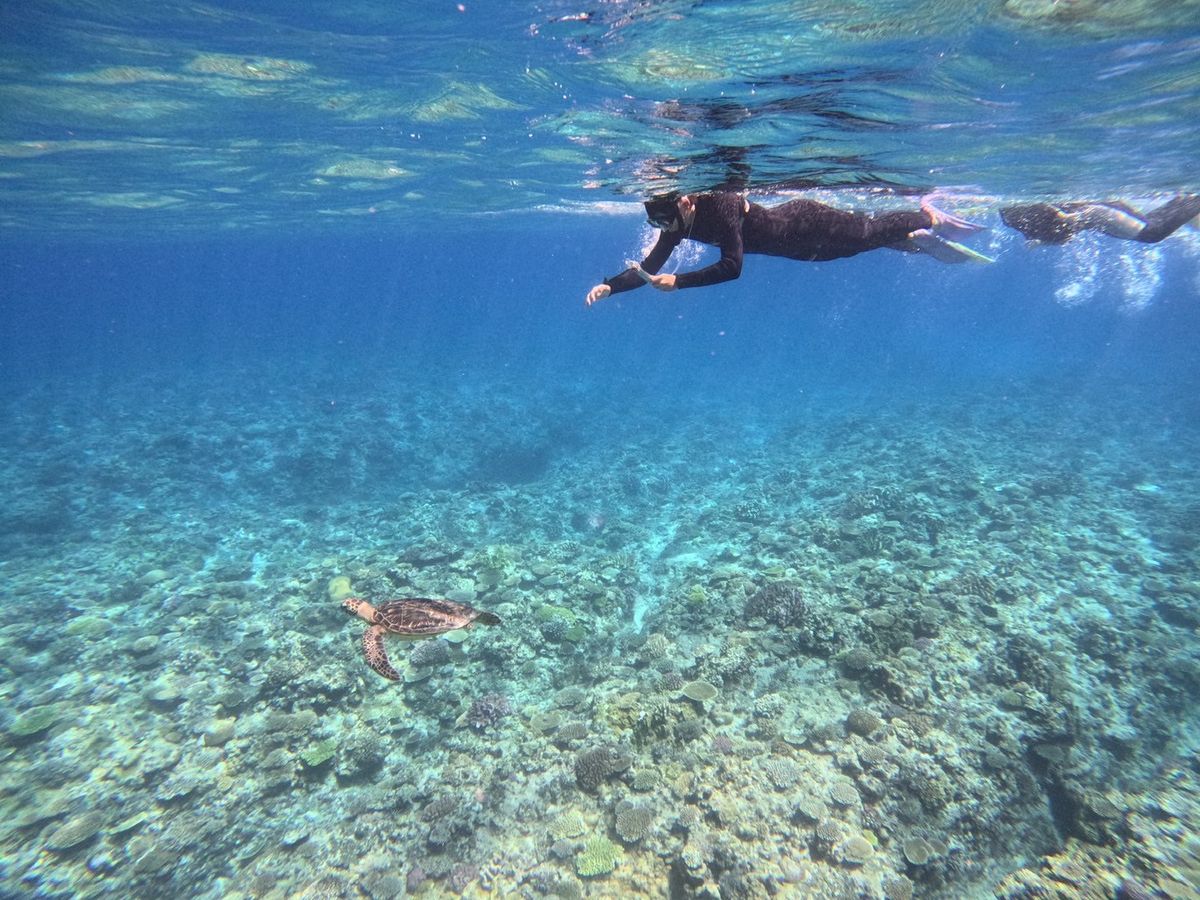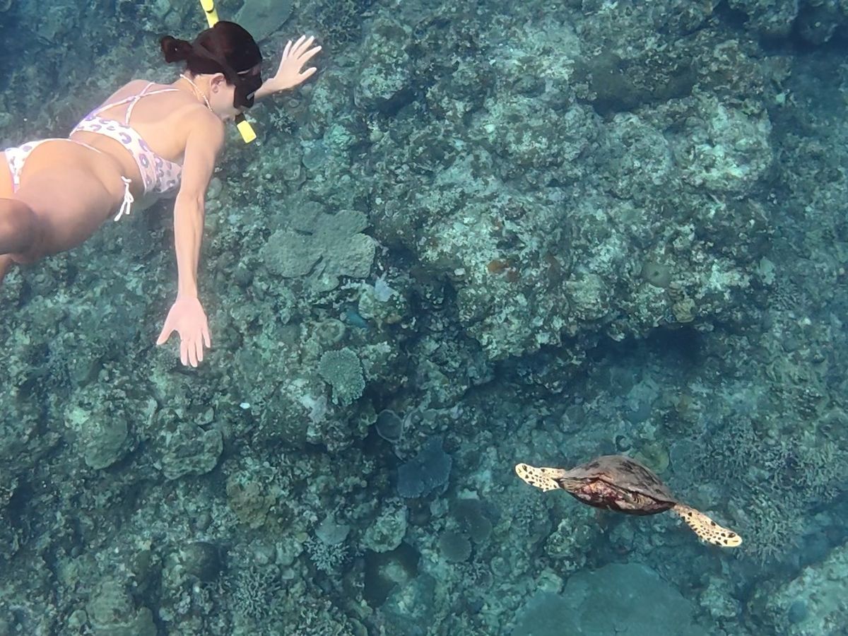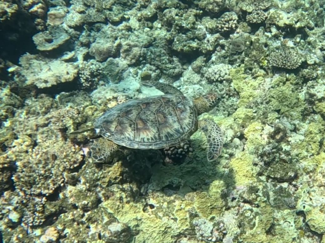 シュノーケリングで見た海中は、たくさんの美しい魚と珊瑚礁と別世界。きわめつけはアオウミガメの優雅な泳ぎが見れ、これは一生ものでした。
