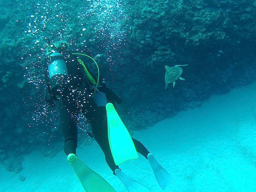 ダイビングでは念願のウミガメと共に泳ぐことができて、