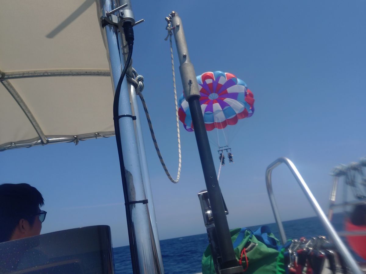 私の回は、5組参加者がいらっしゃって、みんな順番にパラセーリングをするので待ってる間、波に揺られる時間が長いので、酔いやすい方は酔い止めを事前に服用しておいた方がいいと思います。