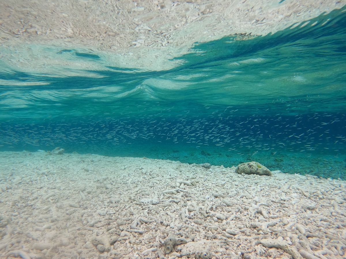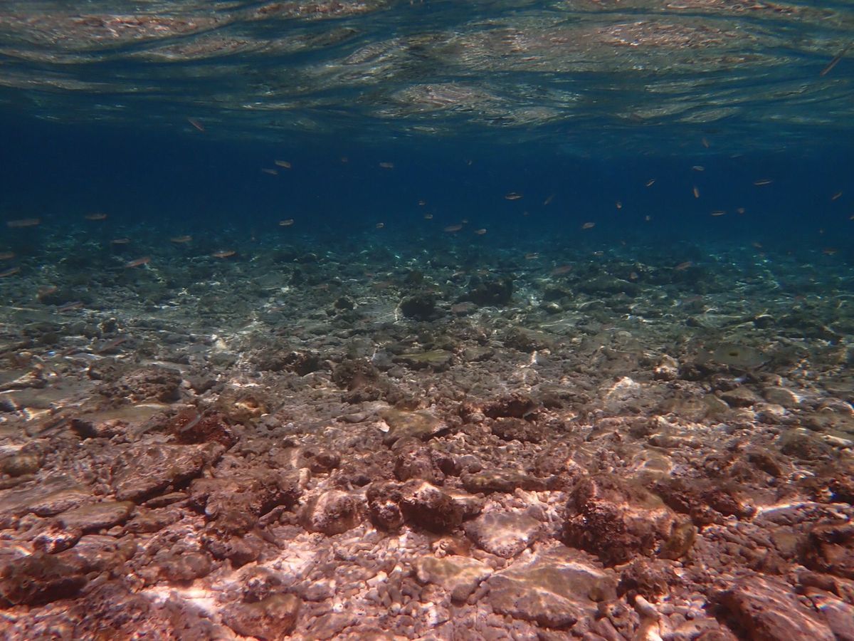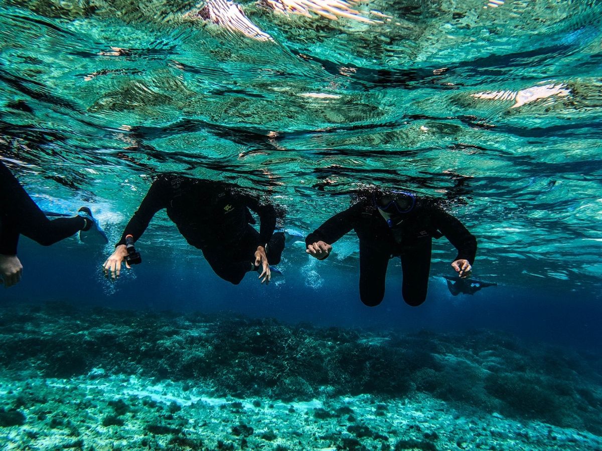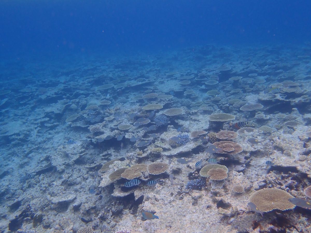水深7-15m程のところに青や黄色の色とりどりの珊瑚礁や魚がいて、透明度が高すぎて怖くなるほどに綺麗な海でした。気温は30℃近くありましたが、水温が高くないので、ウェットスーツのレンタルがおすすめです。
