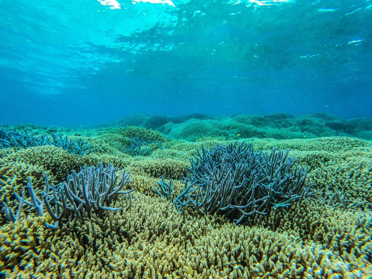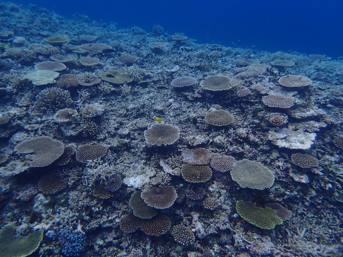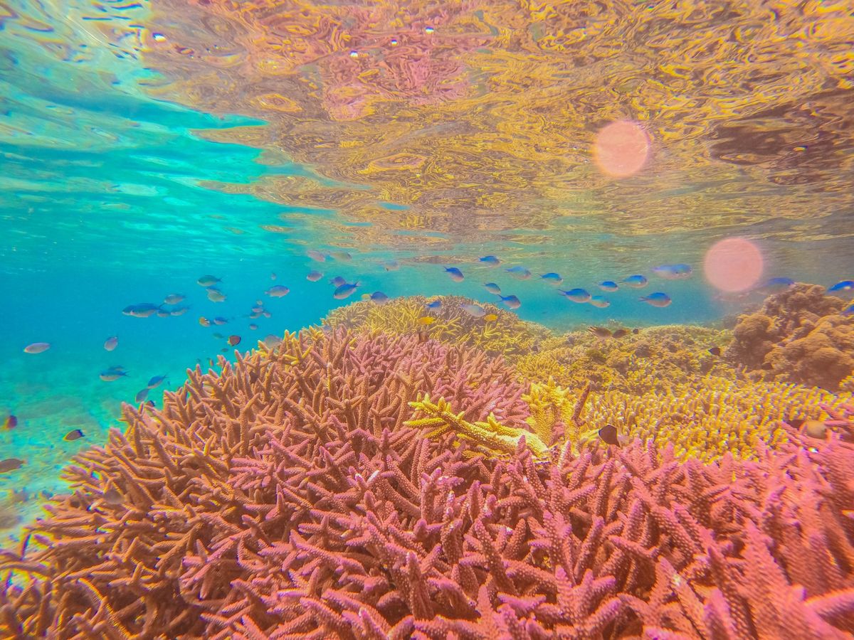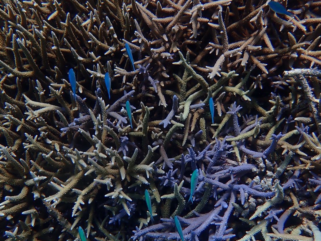 水深7-15m程のところに青や黄色の色とりどりの珊瑚礁や魚がいて、透明度が高すぎて怖くなるほどに綺麗な海でした。気温は30℃近くありましたが、水温が高くないので、ウェットスーツのレンタルがおすすめです。