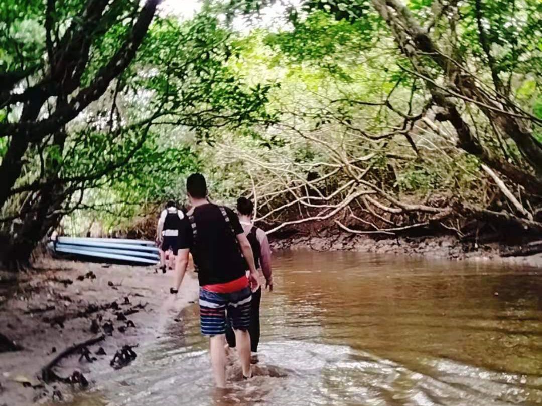 ガイドさんがマングローブの道中説明をしながら進んでいくので、トレッキングとマングローブ林浴を満喫できました。最終地点の滝あたりで、撮影時間が有り、若いグループが滝の真下で水浴びしました。