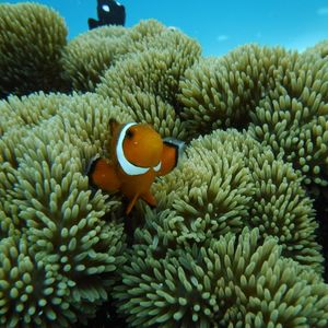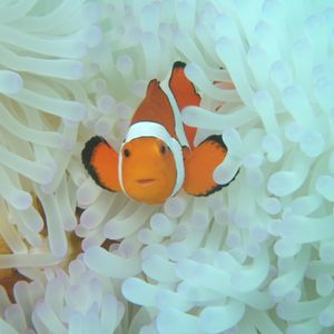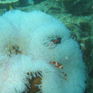機材の関係上5人まで同時に入ることができる。沢山いたので3グループに分かれて入った。待ち時間はライフジャケットを着てプカプカ浮かぶことができた。ただしシュノーケルもゴーグルもないのでほんとに浮かぶだけである。ようやく自分の番になり、何度も耳抜きをしながら海底に着くと白黒のスズメダイの宝庫。サンゴはほとんどなく、砂地ばかりだが、カクレクマノミのいる岩場を案内してもらった。アップの綺麗な写真を撮ってもらえた。自分で撮らせてもらった写真あまり綺麗に撮れなかったが良い思い出に。船への乗り降りで10分、海中散歩は10分といったところだろうか。もう少し見たかったというのが正直な気持ちだが、安全で快適な水中世界を堪能できるアクティビティである。