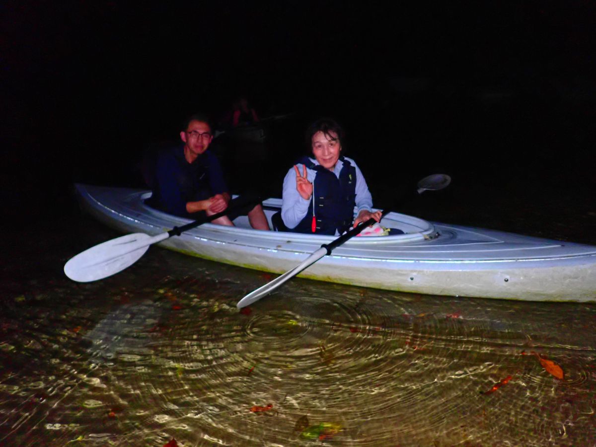 西表島の真っ暗闇だからこそ、夜空の無数の星々が、光輝いて見えて、感動的でした。パドルを軽く動かすだけで、海中に煌めく夜光虫にも驚きました。