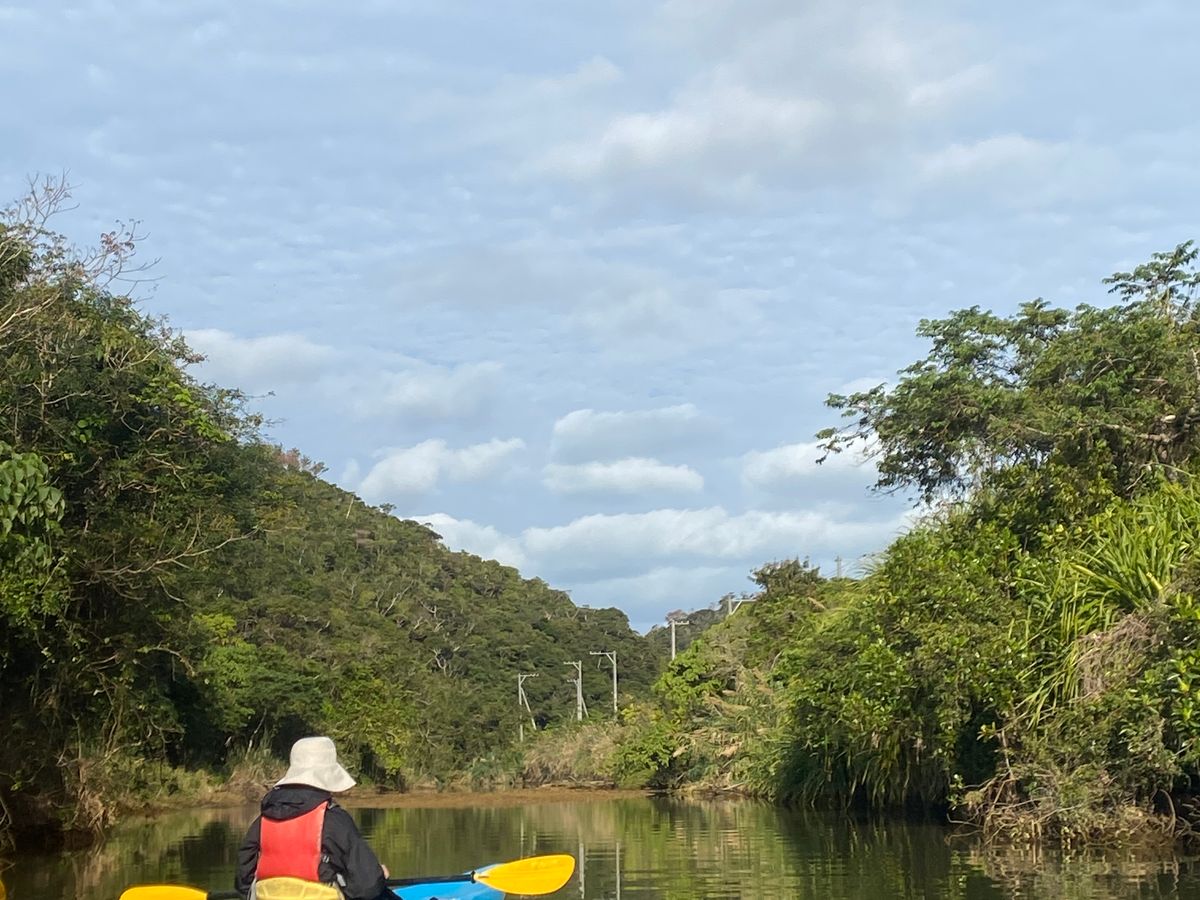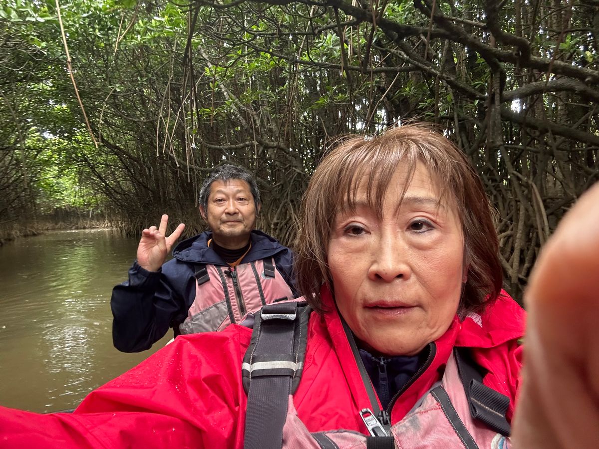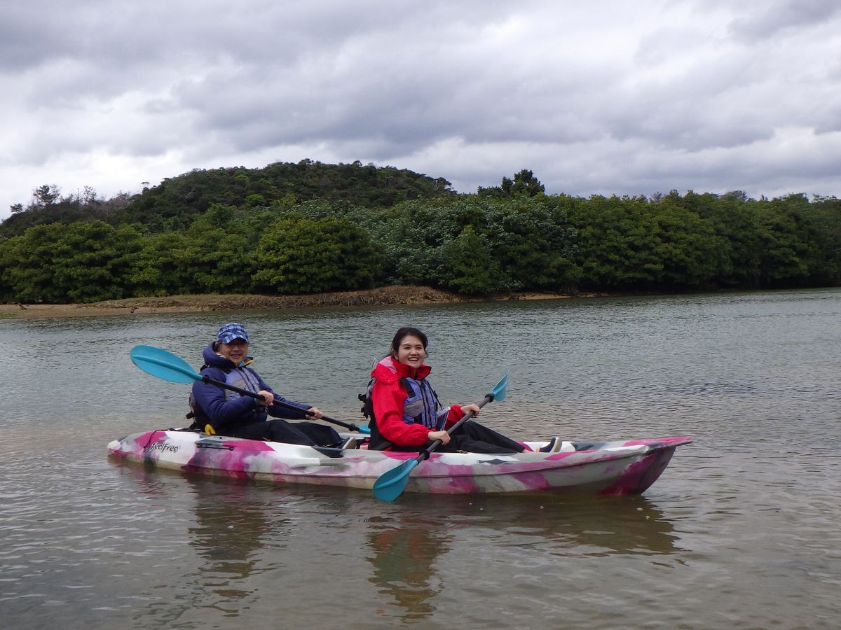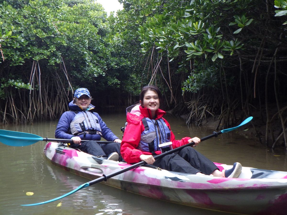 50代の夫婦で参加しました。その日の午前は数組参加とのことでしたが、午後からは私たち1組だけのプライベートツアーになりましたので申し訳なさも手伝って緊張のスタートでした。とても寒く風の強い日で服装に悩みました。レインコートを貸してもらえたので凍えずに済みました!まず陸で乗り降りの仕方、漕ぎ方を丁寧に教えてもらいます。現役漁師のガイドさんがとてもおしゃべりが上手で、植物や川の話だけでなく、沖縄の歴史や風習など地元の人ならではのお話しが聞けてとても良かったです。リラックスしてマングローブの雄大な大自然を満喫できました。ありがとうございました。
