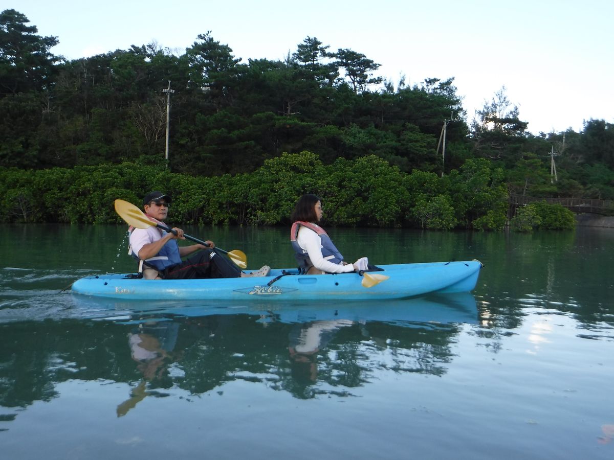 このGWにせっかく大阪から石垣まで行くのなら・・と80歳の母でも参加できるアクティビティを探して見つけたこのツアー。年寄りでも大丈夫ですか?と問合わせて大丈夫ですよ♪との返事を頂いて申し込んだものの、実際にカヌーに乗るまでは私も母も本当に?できるかなぁと不安でした。でも実際カヌーの乗ってしまったら母が仕切る仕切る。「カヌーは息を合わせる事が大切です」と言われてたのに、まったく合わせる気がない。そんな母が気ままに漕いでも、ちゃんと進んでいくので(実はうちらイケてるん違う?)と親子で調子に乗って夕日を見る為に河から海へと漕ぎ出しました。でも残念ながら雲が多かったので河口近くで夕日を断念し、河の上流へと進路変更。段々とあたりが薄暗くなっていく中をゆったりとカヌーを漕ぎながら色々な話を聞くのはとても贅沢で今までに無い経験でした。大きく河に根を張りだしたガジュマルの下では精霊キジムナーの話を聞き「ほんまや、あそこにいてるわ」関西の人はほぼ100%そう言うんですよねとのニコラスさんの冷静な突っ込みに「どこにおるん?あかん、わからん。。見えへん私はもう心の汚れた大人になってしもたんかなぁ・・」悲しそうに呟く母。(自分、幾つやねんっ!)夜のマングローブでつい叫びそうになり周りの生き物達を驚かせてはいけないと思わず自粛。その後も蝙蝠の巣になっている鍾乳洞や夜光虫、雲が晴れて見えた星空など参加しなければ知らなかったものが沢山あり、ひと晩中でもカヌーに乗っていたい気持ちになりました。今度は昼のツアーに参加して夜とはまた違う世界を見たいと思います。ニコラスさん、その時はまた宜しくお願いしますね。今回は楽しいツアー有難うございました。