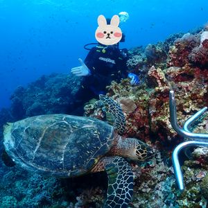 56才ほぼ初心者の私が勇気を持って1人で参加しました!まず、同乗した方々がベテランだらけだったので不安な気持ちでいっぱいでしたが、スタッフの方がきちんとケアして下さり、楽しんでみようという気持ちになれました。が、、、練習の段階で恐怖心で諦めようと思いましたが、私が落ち着いて出来るまで時間を下さり、マンツーマンで手を繋いで誘導して頂いたお陰で、気持ち良く楽しむことが出来ました!結局、1ダイブの予定が海亀を見たくて2ダイブして来ました(笑)安全第一で素敵な世界を見せて下さるスタッフさんです。またチャレンジしたいです!写真も撮って頂き、ありがとうございました。