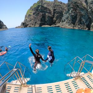7月24日に参加予定でしたが雨予報になっていたので3日前に23日に変更。台風の影響で波が高いとのことで慶良間には行かず本島付近でのシュノーケルになると事前に連絡がありました。それでも家族みんなシュノーケルや船で遊びたかったのでいざ決行!結論、行って大満足!滑り台で海の中にダイブしたりブランコしてダイブしたりジャンプ台からダイブしたり笑。何回ダイブしたかわかりませんが一回転するもよし、バク宙もよし、ウルトラマンスタイルもよしだったので親も童心に返って遊びました!シュノーケルは少し濁ってはいましたが魚もたくさん見られたし満足。