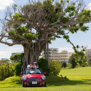ホテルから海までは赤いミニクーパーをオープンにして移動しました。