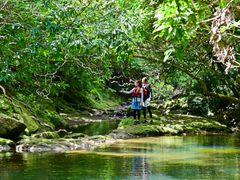 ユツン川沿いの渓流を歩きながらトレッキング。片道15分でモダマ池へ到着し、川遊びや自然観察を満喫できます。魚やエビ探し、全身で水に浸かる体験など、西表島ならではの清流アクティビティを楽しめます。