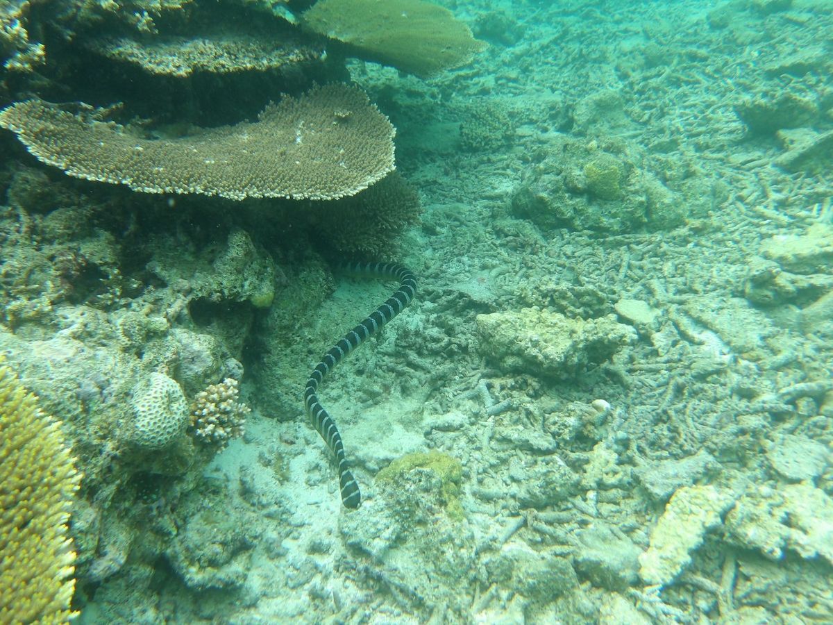シュノーケリングでは海蛇dayだったようで5匹くらい泳いでいるところを見ました。写真はガイドの方が撮ってくださったものです。白骨化した珊瑚が目立ちましたが少しずつ息を吹き返しているそうです。
