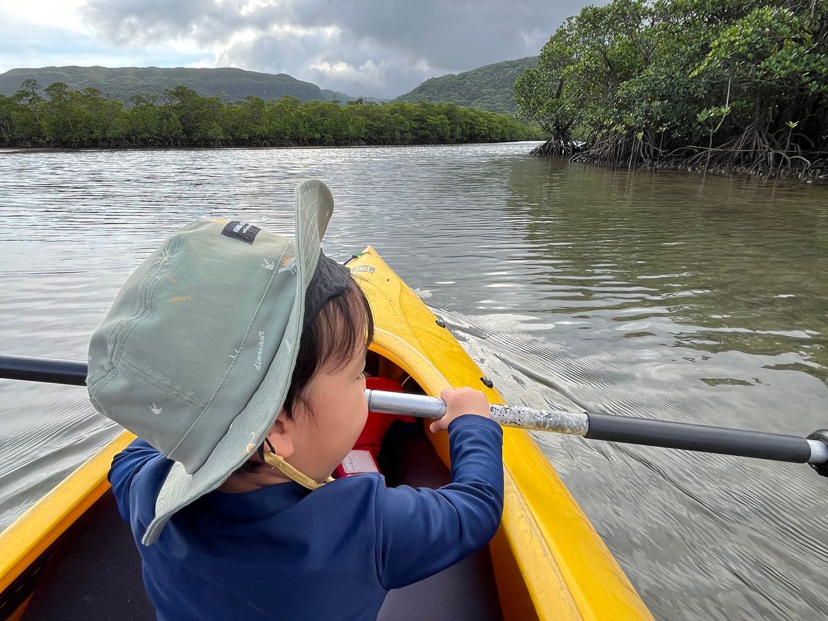 まず、西表でできるカヌー&由布島のツアーを色々と探しましたが、2才児が参加できるカヌーツアーはほとんど見つけられなかったです。2才児OKのツアーあっても2隻に分かれてくださいとの案内で、どんな組み合わせを考えても我が家では無理。ですが風車さんは「まずは4人一緒に乗ってみましょう、難しそうだったら2隻に分かれましょう」と臨機応変に対応してくださり、結果4人で一緒に乗ることができました。子供たちは母親と一緒で安心&漕ぐのは父親が頑張ってくれて、みんな満足なカヌー体験になりました。