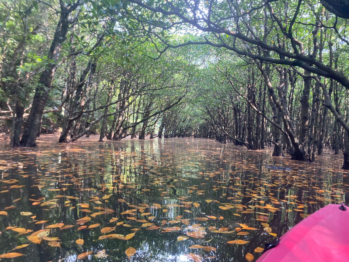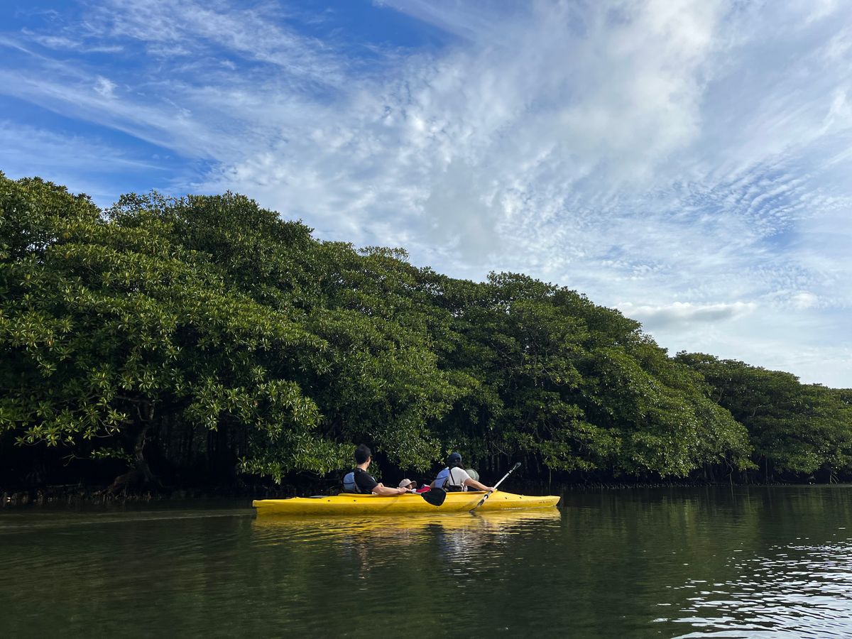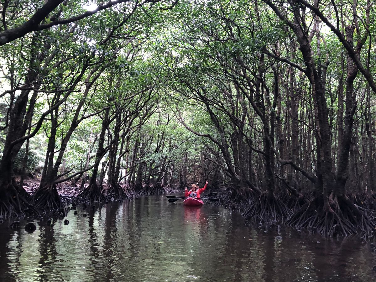 仲間川から支流に入り、2時間ほど漕ぎました。途中、カニやハゼ、マングローブ林の木漏れ日に会えて大満足。ガイドのジョンさんのガイドも親切でした。