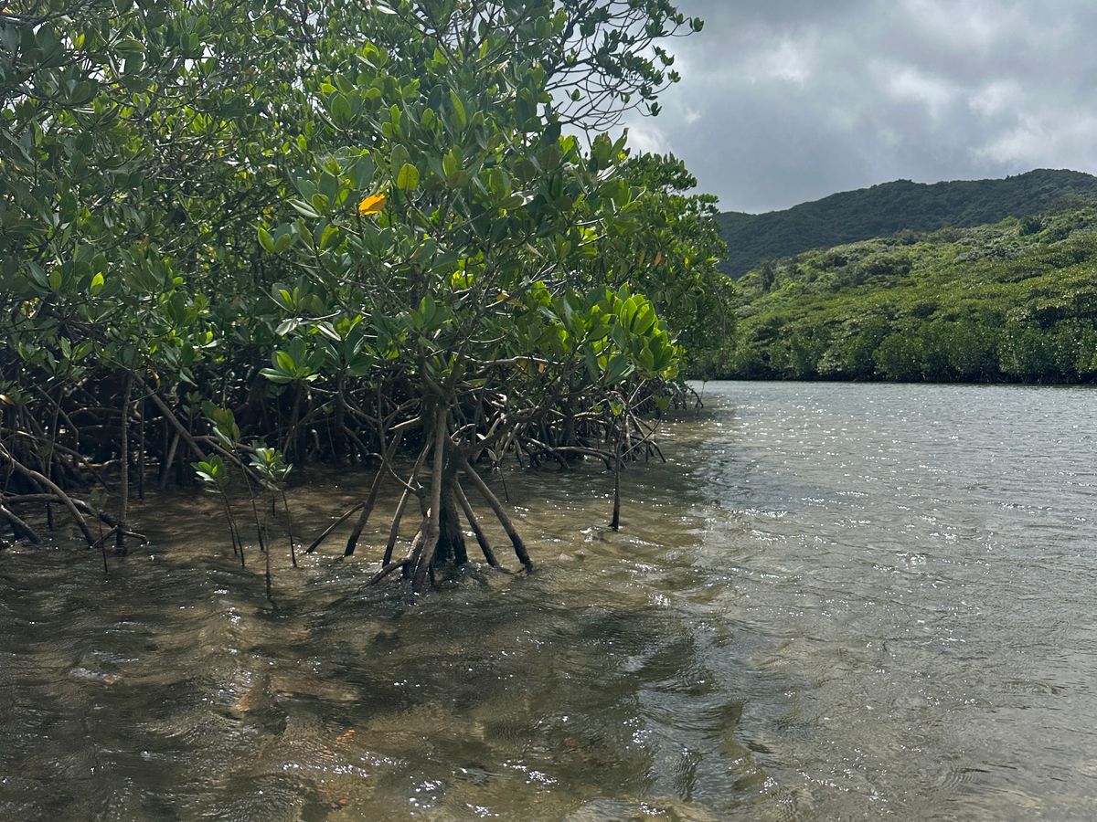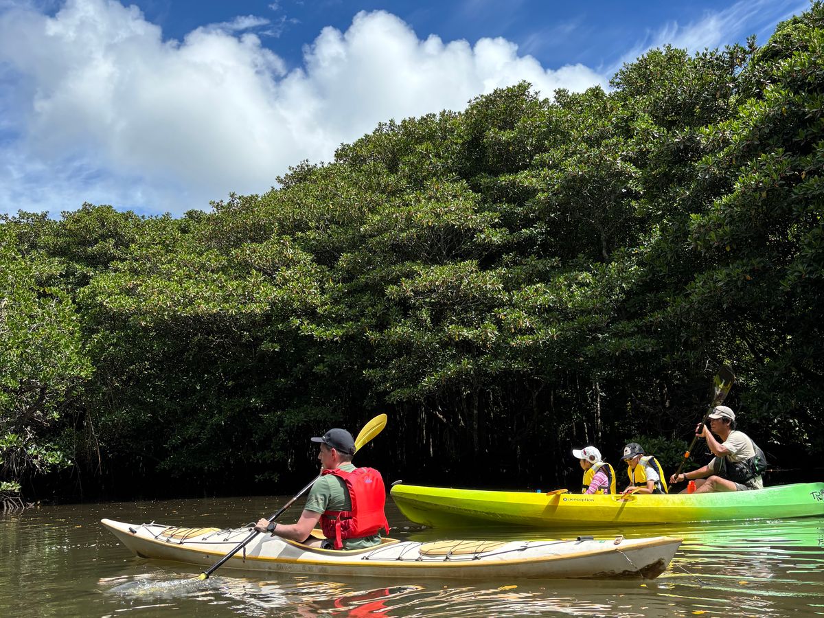 仲間川から支流に入り、2時間ほど漕ぎました。途中、カニやハゼ、マングローブ林の木漏れ日に会えて大満足。ガイドのジョンさんのガイドも親切でした。