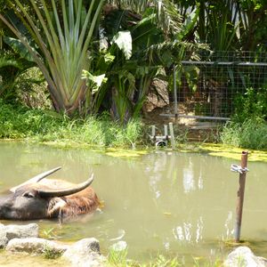 水牛車が10台以上いてビックリ!GW明けの週末でしたがお客様がけっこういて、数台でのんびりかと思いきや団体で次々渡る様にビックリ。ですがのんびりサンシンの音を聴きながら10分ほどで由布島へ到着。島は色とりどりの花や熱帯の植物に囲まれてとても暑いです。水分と日傘は必携です。水牛も島では頭だけ池から出して涼んでいます。花や緑を見るのが好きで散策が好きだったり、写真を撮るのが好きだと楽しめると思います。そうでない方は暑くて歩かないといけないし退屈かも…?蝶々のハウスでは沢山の蝶が舞っていて、なかなか撮れない写真も撮りやすいです。のんびりゆったり見るのが良いので、時間に余裕がある方は満喫出来ると思います。
