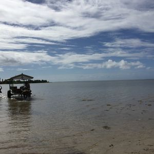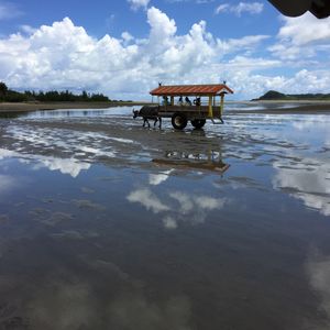 西表・由布島の水牛車に乗りました。静かな日で、海面に映った雲などがとても美しい写真が取れました。竹富島の水牛車とはまた違う、10分あまりの海の旅、楽しかったです。(すぐ横の電柱のところを歩いても渡れて、入場料が600円くらい割引になるのは知りませんでしたが)