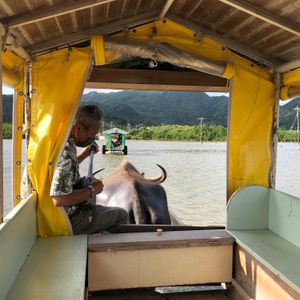 海の中を水牛が進む音ザ-ザ-と進む音が心地よく、乗り手の女性が、島や牛など詳しく教えてくれて、その間水牛の大小の水洗トイレも体験(笑い)その後、彼女の島唄と三線三味線の弾き語りを聴けて最高でした。