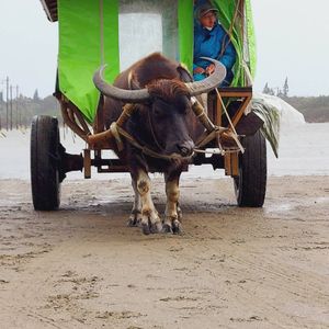 西表島にある水牛車は観光パンフレットにある海を渡るそのものです。