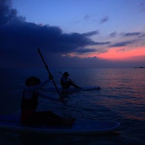 清々しい空気感溢れるものの、まだ暗い朝5時ホテルにピックアップしていただきました。海へ入る前にライフジャケットを着用し進み方やターンなど漕ぎ方のレクチャーを受け出発!薄暗い海面は初心者の私達を優しく迎えてくれる 凪 状態。なのに、あれ?思うように思う方向に進まない笑。