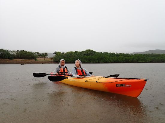 行ったのは仲間川のほぼ河口。しかも強風吹き荒び、時折り強い雨も打ち付ける、こんなんでカヌー大丈夫?と伺いましたら、ガイドさん軽やかに「カヌーは絶対大丈夫!今日は何もしなくても風が運んでくれる〜」って。その言葉を信じて、いざ出発。雨風に打たれながらも楽しい〜! しかし、だんだん風が強くなり、最終目的地まで行くのに、強い風に邪魔されどうなるの〜?と思ったら、ガイドさん、川の中に立ち、風上まで我々のカヌーを引っ張ってくださり、無事にカヌー体験を終えたのでした。