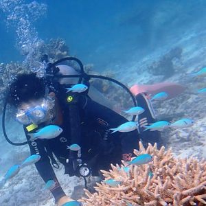 西表島の体験ダイビングに親子で参加しました。ボートで沖合に出て、透明度の高い海のダイビング。インストラクターの方々も親切で、楽しい時間を過ごしました。