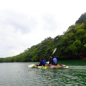 9月の中旬に2人で参加しました。◯石垣島のホテルからツアー当日に西表島に渡る予定でしたが、台風が接近しており、船の運行を不安に思っていましたが、前日にベルトラ経由とショートメールで案内をいただき、電話での照会にも丁寧に応えていただき、安心してツアーに参加できました。(船は往復ともに通常運行されました)◯ツアーには私たちの他に4組、合計10人が参加しており、ガイドは2名の方がついてくださいました。港でピックアップしていただき、事務所で準備をしてから、まずはカヤックへ。河口近くの川幅の広いところから川上へ上り、マングローブの生い茂る狭い支流へ入っていきます。時間帯がほかのツアーより早いこともあるらしく、他のツアー客もおらず川全体が貸切状態でした。天気に恵まれたこともあり、神秘的な雰囲気の森の中をカヤックで進んで行く今までに体験した事のない素晴らしい時間でした。◯カヤックを終え、見晴らしの良い高台の公園でお昼ごはん(ガイドさん手作りの八重山そば!おいしい!)を食べてからキャニオニングへ。ヘルメットなどギアのサイズが豊富で助かりました。山道を少し歩いてから川の中へ入っていきます。天然のスライダーや飛び込みポイントでは丁寧にアシストしてもらい、心置きなく楽しめました。9月でしたが寒くもなく、川の水もそこまで冷たくなく、とにかく爽快でした!4メートルの高さからのジャンプはスリル満点でした!◯川から上がるとまた眺めの素晴らしい展望台で暖かいお茶をいただきほっとひと息つけました。ガイドさんの人柄もよく終始わきあいあいとした雰囲気で本当に楽しい一日になりました!ありがとうございました!