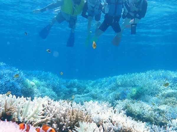 珊瑚礁が船の上から覗いても見えるくらい透き通った海で、青や緑色の綺麗な珊瑚と色とりどりの熱帯魚を楽しむことができました。