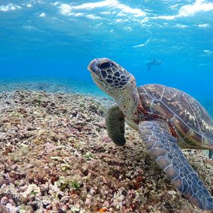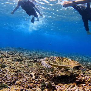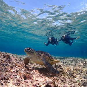 シュノーケリングでは、何匹もの海亀と遭遇することができました。昔から海亀と泳ぐことが夢だったのですが、長い時間海亀と並んで泳げる夢のような時間を過ごしました!