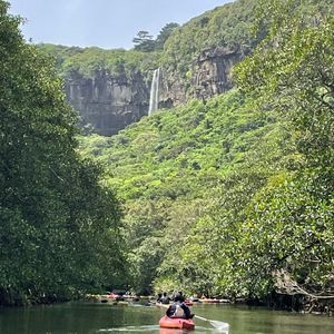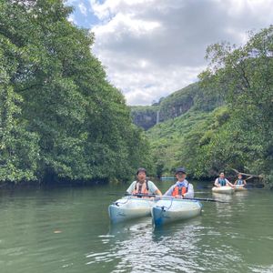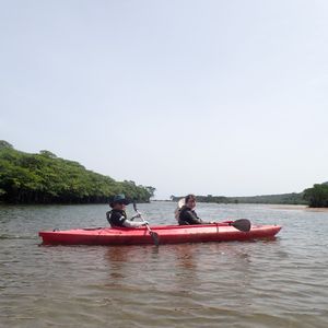 石垣島から上原港へのt直通の船が高波で欠航し、大原港経由でフェリー会社のバスで上原港に1時間遅れでの到着となってしまいましたが、臨機応変にスタートを1時間繰り下げてご対応くださいました。カヌーは初めてでしたが、「慌てないで大丈夫ですよ」と声をかけて下さるので、肩に無用な力も入らず、川岸の神秘的なマングローブの景色を楽しむことができました。カヌーを降りると滝までトレッキングです。狭い山道ですが、私たちにあわせたペースで進んでくださり、ときどき立ち止まっては周りの植物や水辺の生き物説明を交えて下さるので、汗だくになることもなく、快適に最後まで歩を進めることができました。神秘的な「もののけの森」や大自然の滝に感動し、また普段都会で暮らしている私たちが、自分の足で歩いて見に行くことができたことにも、とても驚いています。経験あるツアーガイドさんの上手な導きのおかげです。本当にありがとうございました!