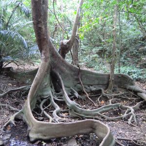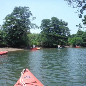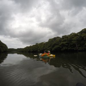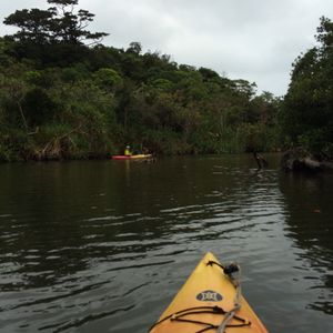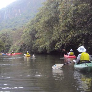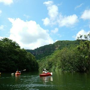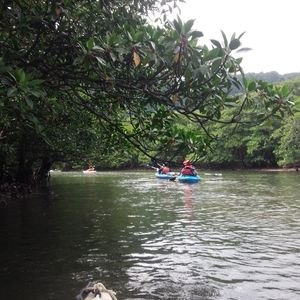 生憎の台風来訪により、海に出れずカヌー&トレッキングのみの半日ツアーとなりました。想定外の快晴、のんびりマングローブを進むカヌーは心地よく、トレッキングは岩場や段差もあり、中々ハード。辿り着いた滝でのひと泳ぎが心地良かった!