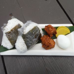 お昼ご飯は手作りのおにぎり、唐揚げ、ゆで卵、たくあん。お腹いっぱいになりました。大自然の中で食べるご飯はとても美味しかったです。