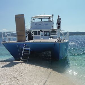 港に戻ったらカッコいい最新船に乗り込みバラス島へ!曇っていても透明度が抜群で本当に綺麗な島でした。そこではシュノーケリングはせずに別のポイントへ。お魚たくさんで楽しかったです。ただプカプカ浮いてると強めのスコールが体をバチバチと打ち付けるのでやや痛かったのと、雷の音がゴロゴロ鳴って怖かったので☆4つ。内容やサービスは満点です!特に船に更衣室や脱水機があるのと、シュノーケリング後の黒砂糖、冷え冷えのさんぴん茶水筒が嬉しかったです!