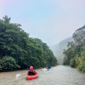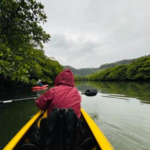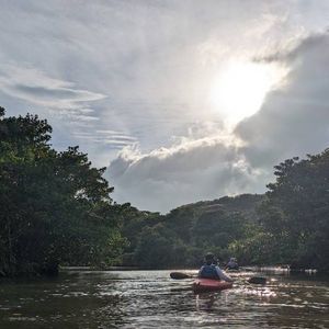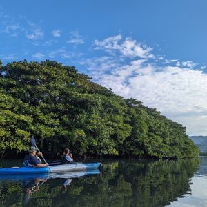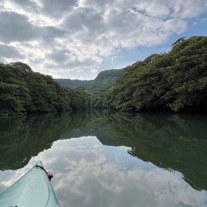 4月上旬、家族4人でツアーに参加しました。早朝は天気が曇りで、川一面に薄い霧が立ちこめて神秘的な雰囲気でした。鳥や虫の鳴き声以外は何も聞こえず、カヌーを漕ぎながらマングローブに生えている植物や動物を観察しました。ガイドさんの話を聞きながら、丁度良い程度のトレッキングをして滝つぼの近くまで行き、マイナスイオンたっぷりの水しぶきを浴びました。帰りはすっかり天気が晴れて、沖縄なまりのカラスの鳴き声を聞きながら笑顔で帰りました。行きも帰りも他のツアー客との時間差があり、家族で貸し切り状態で本当に素晴らしいツアーでした。午後は水牛車を体験する予定でしたが、4月からバスやフェリーのダイヤが新しくなったようで、ガイドの方が丁寧に調べて教えてくださったおかげで午後の体験も無事に終えました。素晴らしいツアーで、ぜひお勧めしたいです。