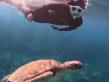 ふたり連れの女性2人と合わせて3人の参加者に対し、ガイドさん1人でした。初めてのシュノーケリングで、海で泳ぐこと自体が20年ぶりくらいでしたが、ウエットスーツの浮力とフィンのおかげか、問題なくみんなに着いていけました。距離は結構泳ぎますが、参加者が力尽きた時のために、ガイドさんが浮き輪のようなものを持っていたので、安心感がありました。ガイドのリュウトさんのおかげで、海亀3匹に加え、カクレクマノミなど色とりどりのお魚を見られて、大満足です。しかも、深いところまで潜って写真も沢山撮ってきてくださいます。