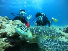 体験ダイビングコースとシュノーケリングコースの方が混乗でしたが、体験ダイビングコースも最初は水と呼吸に慣れるためシュノーケリングから行います。シュノーケリングではマスクをセットし水中に飛び込むともう目の前にたくさんの魚が!!驚くほどたくさんの、大小様々な魚が泳いでいました。もうシュノーケリングだけで充分・・・という気分になりましたがせっかくなのでメインの体験ダイビングも。開始前には耳抜きの仕方や水中でのサインをインストラクターさんが丁寧に教えてくれました。実際海に入ったら下がるごとにやっぱり耳が痛くなりましたが、インストラクターさんが丁寧にフォローしてくださり、ゆっくりゆっくり水圧を下げながら少しずつ耳抜きをしながら、海底にたどり着くことができました。一人では耳の圧に不安を感じめげてしまいそうだったので本当に感謝です。