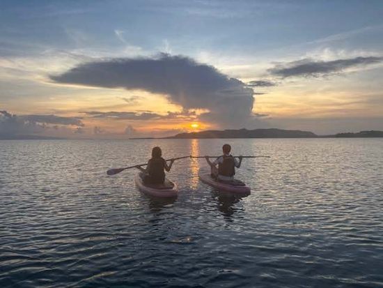 赤道近くの石垣島でSUPを楽しむサンセットツアー。赤く染まる夕陽を海の上から眺める非日常体験ができます。穏やかな海で癒しの時間を♪