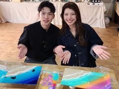 アクリル絵の具で描いた海に専用のレジン液を流し込みキラキラ輝く海のアートを制作