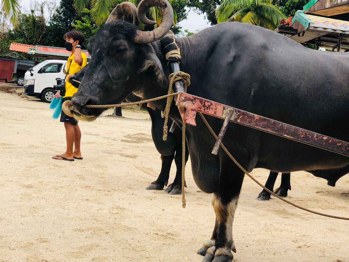 初水牛。やっぱり間近で見る牛さんは大きくてツノも立派!私たちを担当してくれたトミーは、竹富島からつけた名前で、ツノがハート♥️型のベテラン牛さんでした。竹富出身ではないらしいですが、のんびり、のーんびり三味線と唄を聴きながら沖縄の民家が見えて良かったです。最後に撮影写真もあり、トミーは、疲れたのか目を閉じてうとうとしていましたが、そこも可愛かったです。