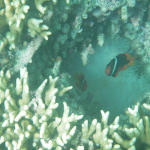 その後また船を飛ばして珊瑚礁の海にシュノーケリングに行きました。マスクの付け方や浅い珊瑚礁の所では、立ち泳ぎをしないようにとかの注意を聞いて一人づつ海に入りました。海の中をのぞいた瞬間「すごい綺麗!」とおもわず大きな声が出てしまいました。目の前に広がる珊瑚礁と色とりどりの魚達が泳ぐ光景は感動ものです。スタッフの方が素潜りで海藻を揺らしてクマノミを見せてくれました。直に見たのは初めてでうれしかったです。スタッフの方はとても気さくで優しく ひとりひとりに気を配ってくれます。疲れた時用に浮き輪的な物も用意してくれています。シュノーケリングが初めての方でも安心して参加できると思います。帰りはわざとスピードを上げて波間を飛ばし ちょっとしたアトラクションのようで 最後の最後まで楽しめました。少し残念なお天気でしたが、人当たりのいい話上手なスタッフと きれいな器材 よく考えられた水洗トイレ(笑)で よい半日を過ごせました。ありがとうございました。