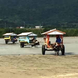 由布島の水牛車は、その日の潮の干満によってまた違った表情をするので、